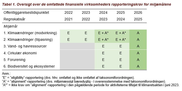 - ”Miljøretsakten” (den delegerede forordning med tekniske screeningskriterier for de sidste fire miljømål), der også ændrer i den delegerede forordning til artikel 8 i TR, har fundet anvendelse siden januar 2024.