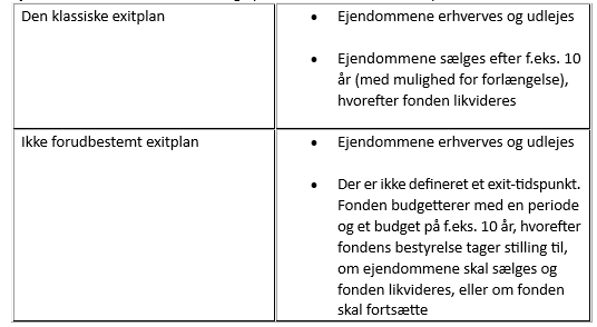 Ejendomsfonde med en klassisk exitplan er efter Finanstilsynets vurdering en fond med en investeringsstrategi, der fokuserer på investering i aktivet (ejendommen og dens værdi). Det må formodes, at hovedformålet med erhvervelsen af ejendommene er køb med henblik på at opnå fortjeneste ved salg, når der f.eks. er økonomisk opsving på boligmarkedet. Udlejning af ejendommene, indtil de sælges, anses for at være den sekundære strategi. Hvis ejendomsfonden samtidig delegerer de administrative og driftsrelaterede opgaver til et ejendomsadministrationsselskab, indikerer det yderligere, at fonden ikke har det primære fokus på drift af ejendomme, hvorfor fonden kan blive omfattet af AIF-begrebet, hvis betingelserne nævnt i § 3, stk. 1, i FAIF-loven og i bekendtgørelse om alternative investeringsfonde i øvrigt er opfyldt.