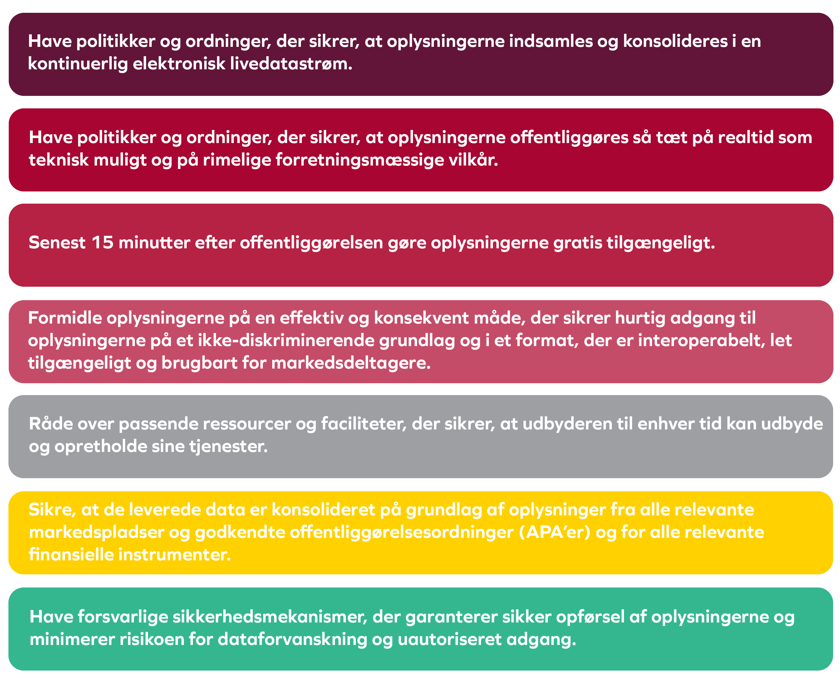 Virksomhed som godkendt udbyder af konsolideret løbende handelsinformation (CTP) består i at indsamle efterhandelsdata fra markedspladser og godkendte offentliggørelsesordninger (APA) og offentliggøre disse oplysninger (herefter oplysningerne) i konsolideret form for så vidt angår: