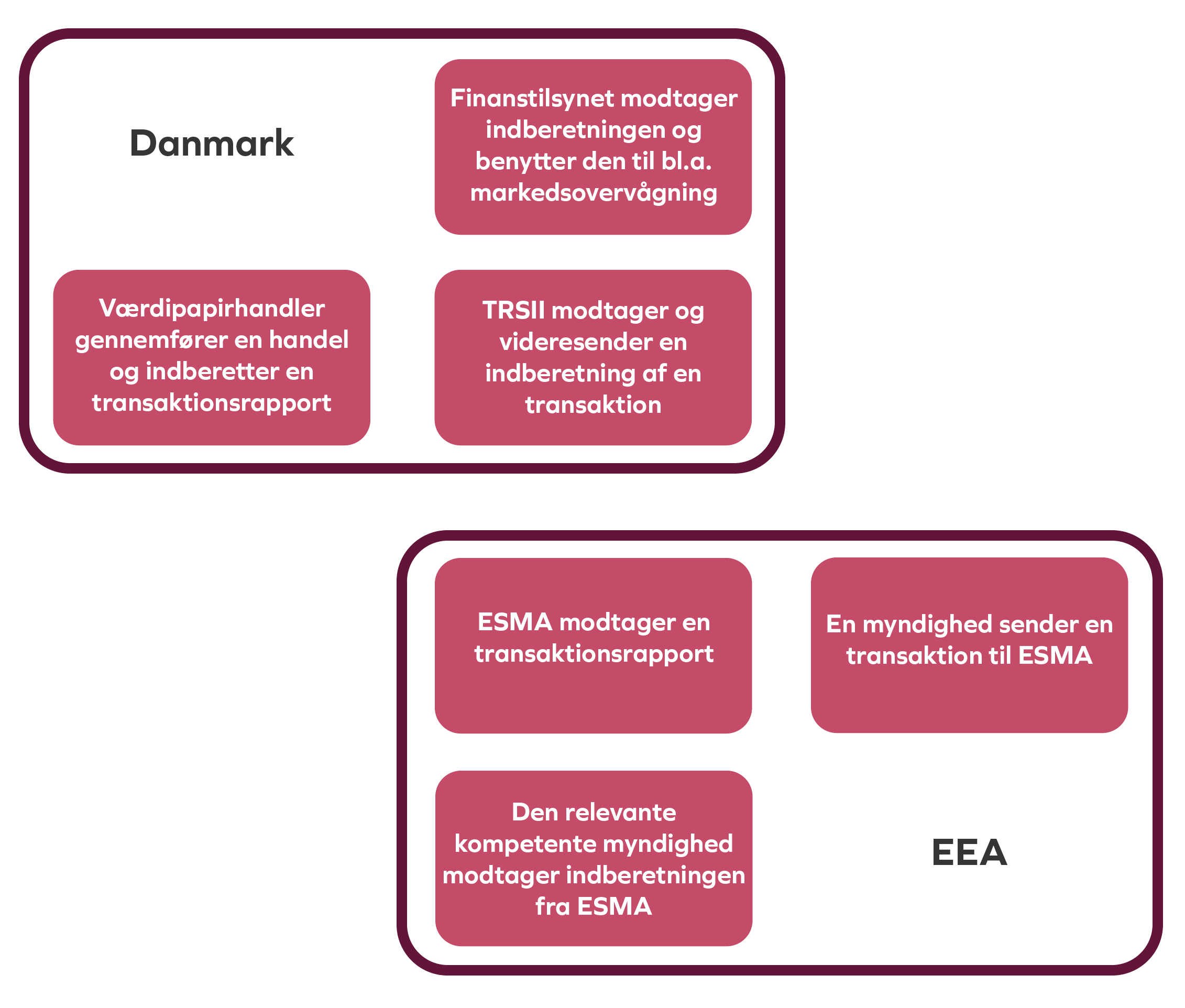 Rapporter for transaktioner gennemført på markedspladser udenfor Finanstilsynets myndighed bliver videresendt til den relevante kompetente myndighed via ESMA’s IT-service. På samme måde modtager Finanstilsynet tilsvarende rapporter om transaktioner i danske værdipapirer gennemført med udenlandske værdipapirhandlere.