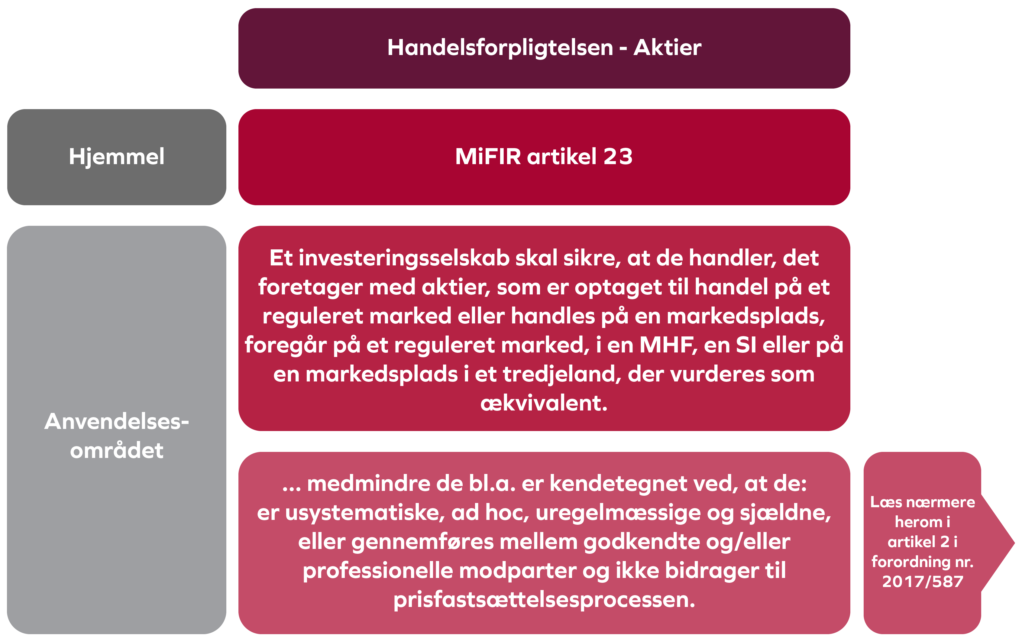Denne handelsforpligtelse kræver, at investeringsselskaber gennemfører alle handler på et reguleret marked, en MHF, gennem en SI eller på en tilsvarende markedsplads i et tredjeland. Det gælder både handler for egen regning og handler i form af udførelse af kundeordrer.