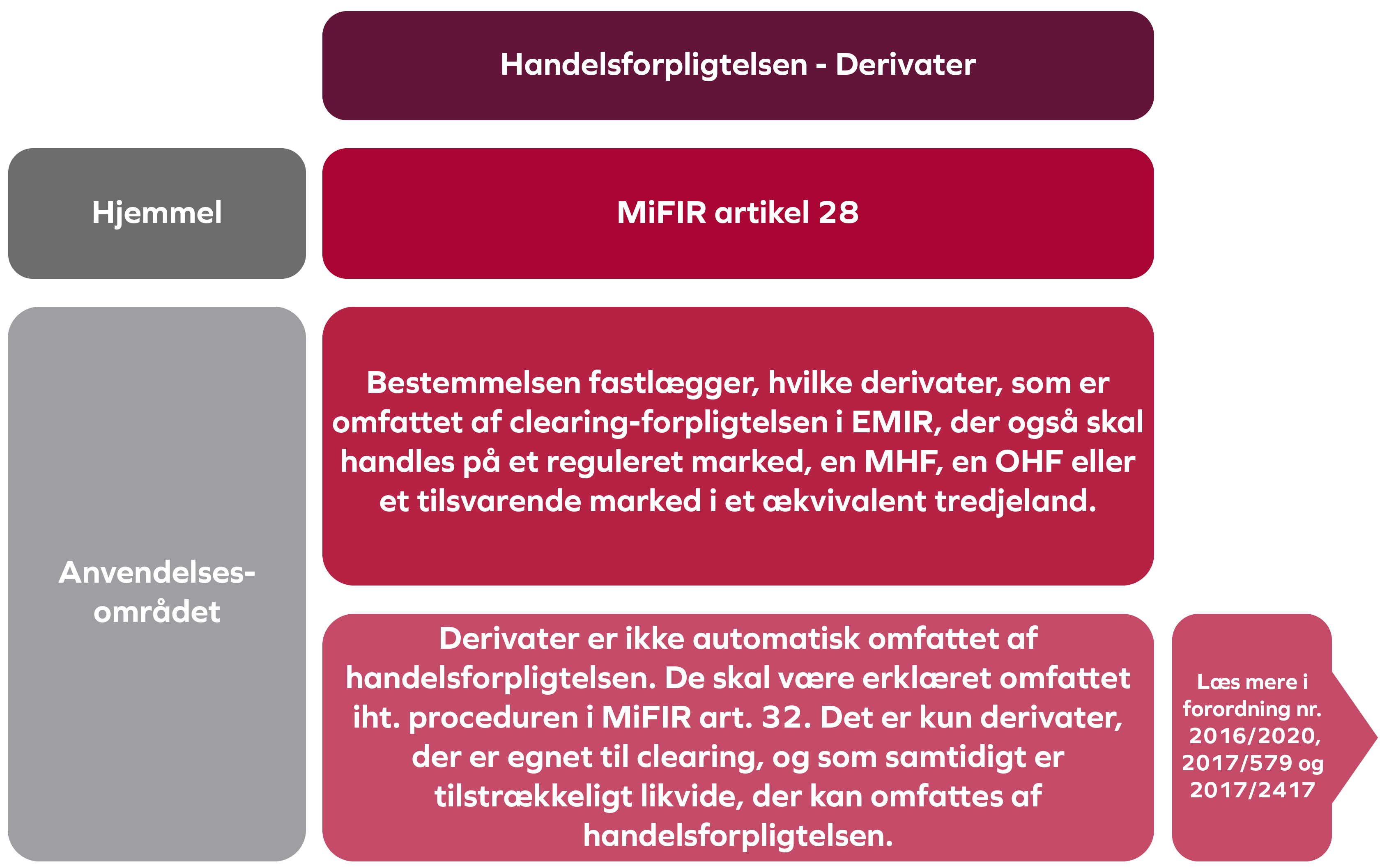 Anvendelsen af handelsforpligtelsen er defineret i artikel 32 i MiFIR. Artiklen beskriver den proces, som afgør, hvilke derivater der er omfattet af handelsforpligtelsen.