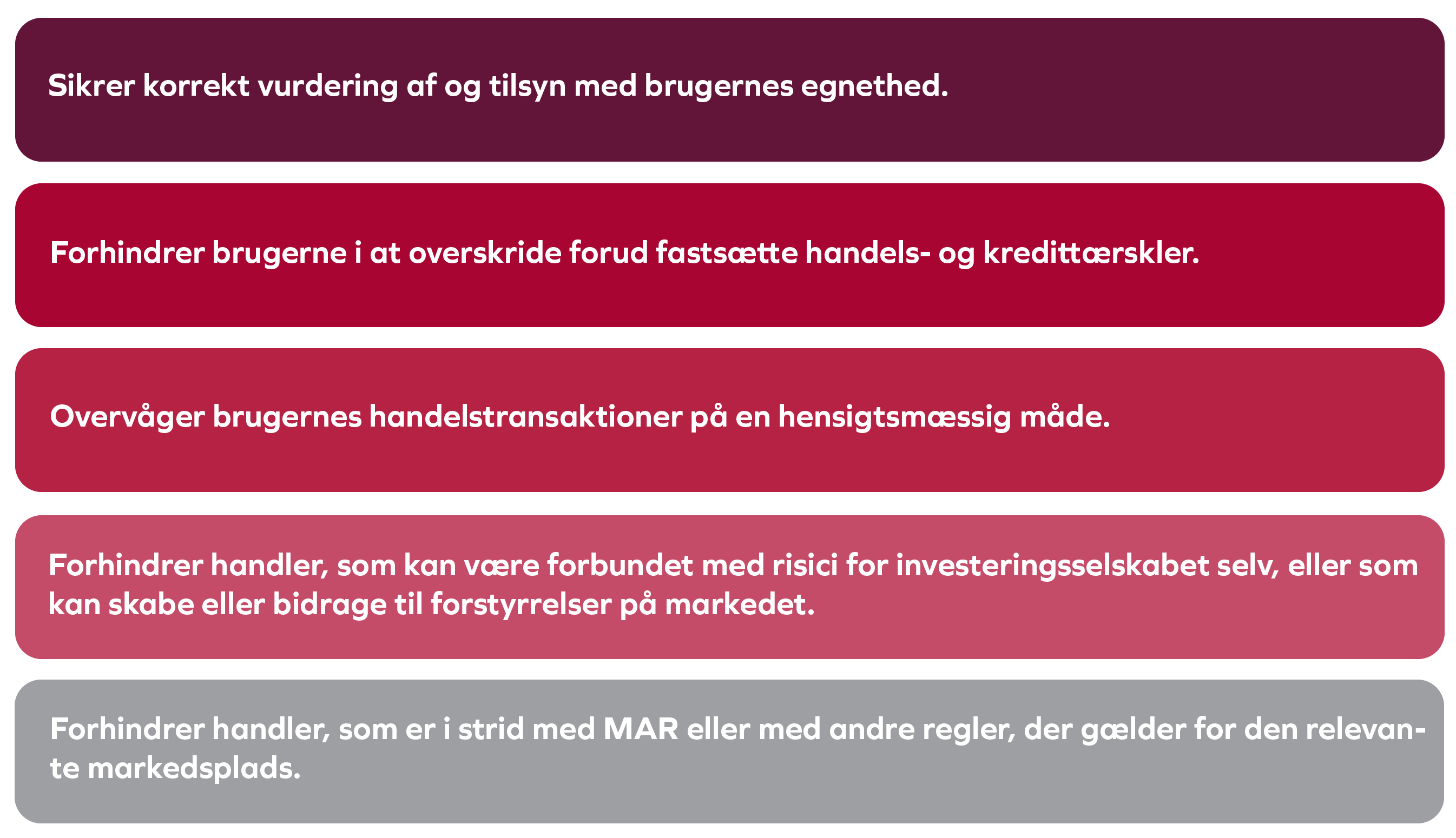 Kravene til et investeringsselskab er nærmere specificeret i kapitel 3 i Forordning 2017/589 om præcisering af de organisatoriske krav til investeringsselskaber, der benytter algoritmisk handel.
