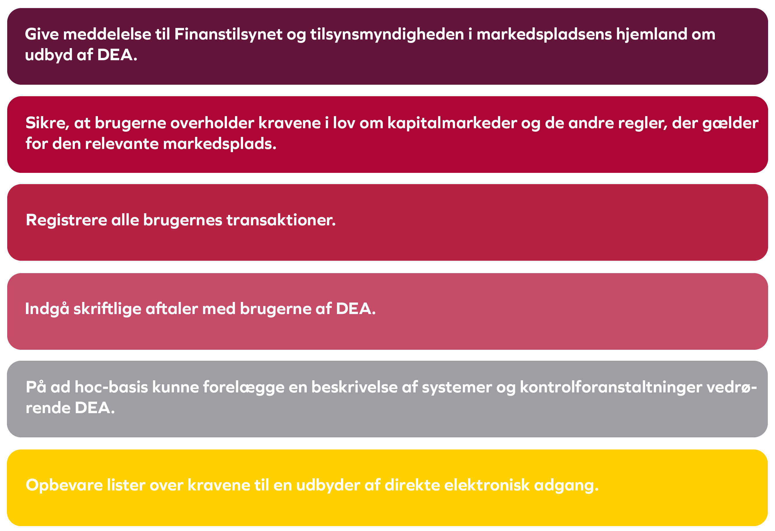 I henhold til kapitalmarkedsloven er medlemmer af markedspladser, der udbyder direkte elektronisk adgang til deres kunder, underlagt regulering og krav.