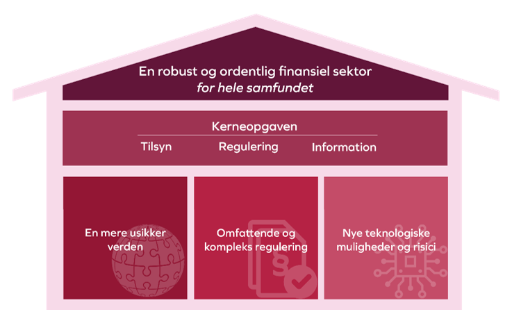 Kerneopgaven er: tilsyn med de finansielle virksomheder, udarbejdelse af ny regulering og information til vores omverden.